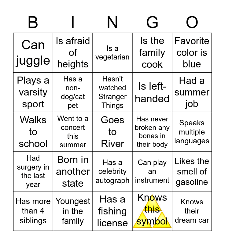 This bingo card has 1 images, a free space and 24 words: Born in another state, Youngest in the family, Hasn't watched Stranger Things, Has more than 4 siblings, Favorite color is blue, Can juggle, Plays a varsity sport, Is afraid of heights, Has never broken any bones in their body, Has a celebrity autograph, Is left-handed, Walks to school, Can play an instrument, Likes the smell of gasoline, Has a non-dog/cat pet, Knows this symbol, Speaks multiple languages, Is a vegetarian, Had a summer job, Went to a concert this summer, Knows their dream car, Had surgery in the last year, Is the family cook and Has a fishing license.