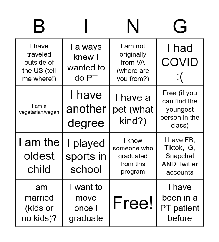 This bingo card has 17 words: Free!, I am married (kids or no kids)?, I am not originally from VA (where are you from?), I have traveled outside of the US (tell me where!), I played sports in school, I had COVID :(, I have FB, Tiktok, IG, Snapchat AND Twitter accounts, I have a pet (what kind?), Free (if you can find the youngest person in the class), I have another degree, I want to move once I graduate, I know someone who graduated from this program, I am a vegetarian/vegan, I always knew I wanted to do PT, I am the oldest child, I am an only child and I have been in a PT patient before.
