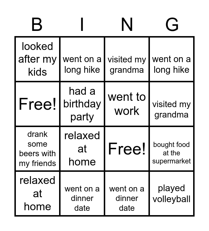 This bingo card has 16 words: went on a dinner date, bought food at the supermarket, visited my grandma, looked after my kids, drank some beers with my friends, went on a long hike, Free!, went on a dinner date, Free!, had a birthday party, relaxed at home, went on a long hike, relaxed at home, visited my grandma, went to work and played volleyball.