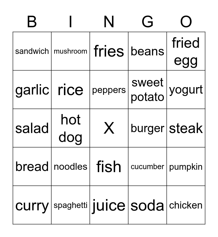 This bingo card has a free space and 29 words: curry, pickle, hot dog, pizza, sandwich, fries, rice, noodles, burger, spaghetti, steak, chicken, juice, soda, yogurt, meat, fish, bread, fried egg, salad, cucumber, onion, sweet potato, garlic, beans, mushroom, pumpkin, peppers and peas.