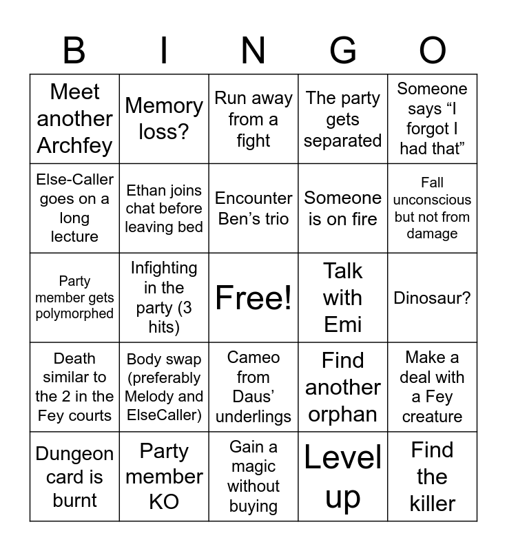This bingo card has a free space and 24 words: Body swap (preferably Melody and ElseCaller), Party member KO, Encounter Ben’s trio, Dungeon card is burnt, Someone says “I forgot I had that”, Meet another Archfey, Else-Caller goes on a long lecture, Memory loss?, Talk with Emi, Cameo from Daus’ underlings, Someone is on fire, Party member gets polymorphed, Find another orphan, Make a deal with a Fey creature, Ethan joins chat before leaving bed, Level up, Dinosaur?, Run away from a fight, Fall unconscious but not from damage, Infighting in the party (3 hits), Find the killer, Death similar to the 2 in the Fey courts, The party gets separated and Gain a magic without buying.