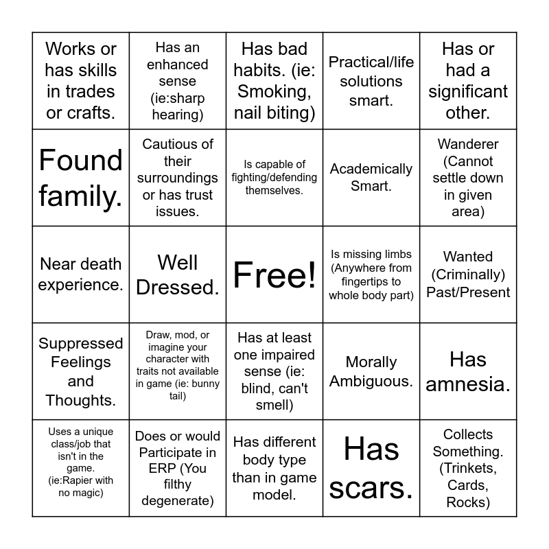 This bingo card has a free space and 24 words: Draw, mod, or imagine your character with traits not available in game (ie: bunny tail), Does or would Participate in ERP (You filthy degenerate), Is capable of fighting/defending themselves., Uses a unique class/job that isn't in the game. (ie:Rapier with no magic), Has or had a significant other., Works or has skills in trades or crafts., Found family., Has an enhanced sense (ie:sharp hearing), Is missing limbs (Anywhere from fingertips to whole body part), Has at least one impaired sense (ie: blind, can't smell), Academically Smart., Near death experience., Morally Ambiguous., Has amnesia., Cautious of their surroundings or has trust issues., Has scars., Wanted (Criminally) Past/Present, Has bad habits. (ie: Smoking, nail biting), Wanderer (Cannot settle down in given area), Well Dressed., Collects Something. (Trinkets, Cards, Rocks), Suppressed Feelings and Thoughts., Practical/life solutions smart. and Has different body type than in game model..