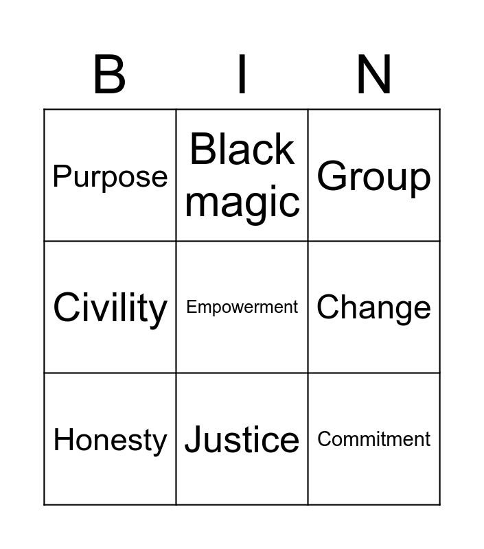 This bingo card has 17 words: Self, Other, Group, Purpose, Community, Civility, Trust, Honesty, Justice, Change, Society, Equity, Empowerment, Black magic, Commitment, Togetherness and Congruence.