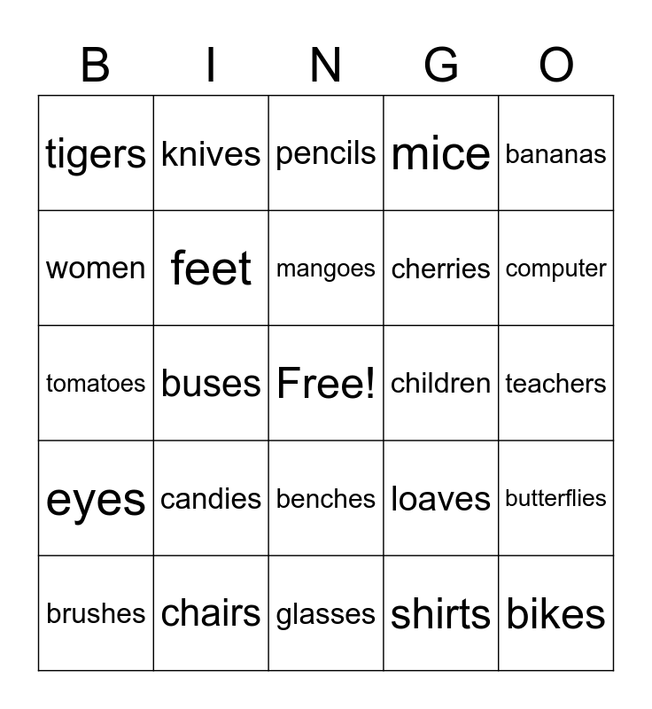 This bingo card has a free space and 50 words: books, bikes, boxes, glasses, candies, leaves, knives, men, women, teeth, feet, mice, butterflies, loaves, watches, photos, mangoes, children, geese, bananas, buses, shirts, tigers, cherries, oxen, lamps, computer, toys, pencils, benches, fish, strawberries, boys, girls, chairs, sheep, trees, baskets, students, teachers, flowers, windows, thieves, foxes, brushes, tomatoes, gloves, trainers, eyes and carrots.