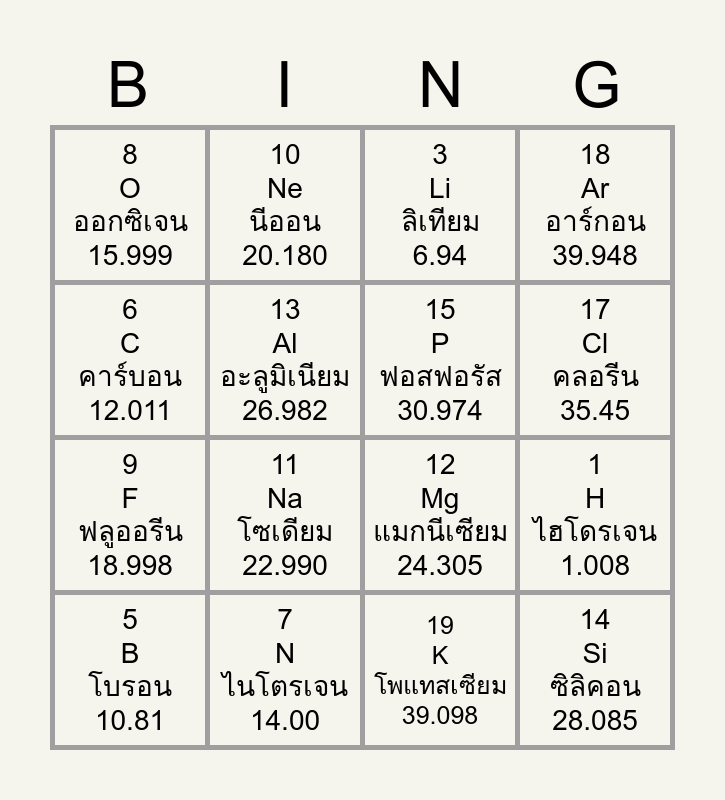 This bingo card has 20 words: 1 H ไฮโดรเจน 1.008, 2 He ฮีเลียม 4.0026, 3 Li ลิเทียม 6.94, 4 Be เบริลเลียม 9.0122, 5 B โบรอน 10.81, 6 C คาร์บอน 12.011, 7 N ไนโตรเจน 14.00, 8 O ออกซิเจน 15.999, 9 F ฟลูออรีน 18.998, 10 Ne นีออน 20.180, 11 Na โซเดียม 22.990, 12 Mg แมกนีเซียม 24.305, 13 Al อะลูมิเนียม 26.982, 14 Si ซิลิคอน 28.085, 15 P ฟอสฟอรัส 30.974, 16 S กำมะถัน 32.06, 17 Cl คลอรีน 35.45, 18 Ar อาร์กอน 39.948, 19 K โพแทสเซียม 39.098 and 20 Ca แคลเซียม 40.078.