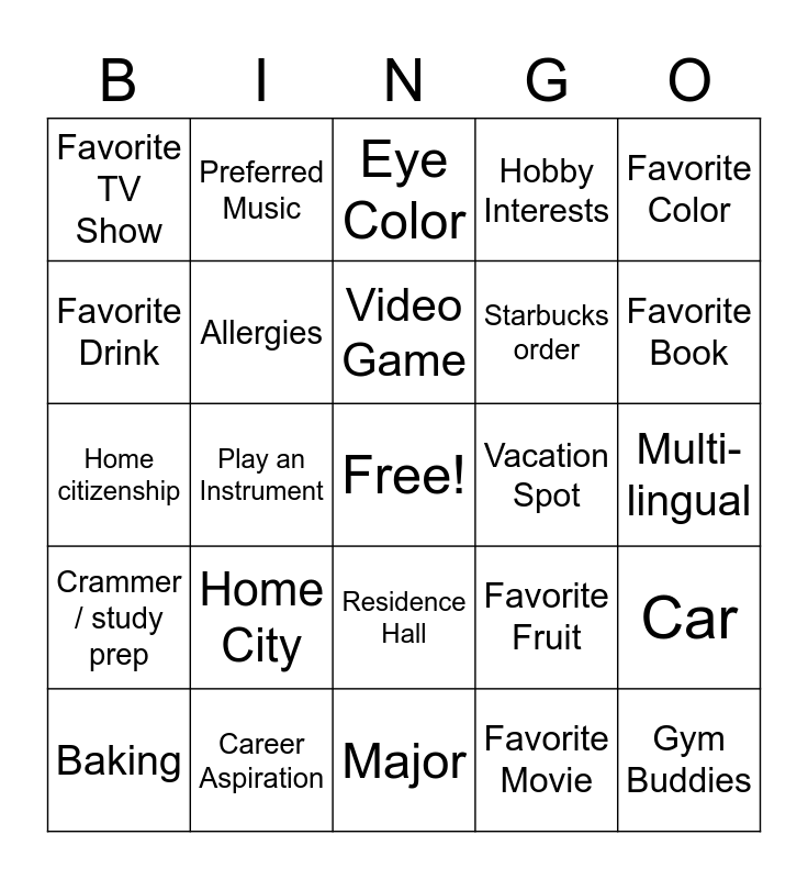 This bingo card has a free space and 50 words: Tattoo / Piercing, Gym Buddies, Pets, Major, Home City, Favorite Superhero, Preferred Music, Favorite Food, Favorite Drink, Siblings, Allergies, Hobby Interests, Car, Favorite Fruit, Board Game, Card Game, Video Game, Vacation Spot, Favorite Season, Favorite Color, Play an Instrument, Favorite Movie, Favorite TV Show, Starbucks order, Outdoor activity (biking/hiking), Mechanically savvy, Favorite Book, Preferred reading genre, Eye Color, Residence Hall, Commuters, DoIT Team, Expected Graduation, High School, Career Aspiration, Play sports, Favorite Sports Team, Live concert / band, Side hustle, Multi-lingual, Clubs, Volunteer time, Degree aspiration, Cooking, Baking, Home citizenship, Introverted / extroverted, Favorite youtube channel, Crammer / study prep and Favorite Comic.