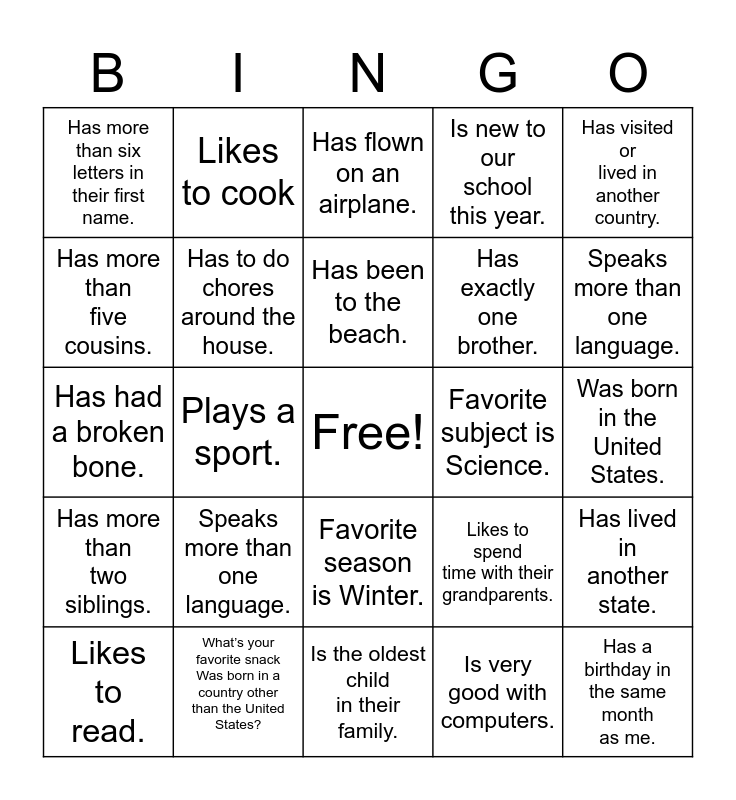 This bingo card has a free space and 24 words: Speaks more than one language., What’s your favorite snack Was born in a country other than the United States?, Has been to the beach., Likes to read., Has visited or lived in another country., Has more than six letters in their first name., Has more than five cousins., Likes to cook, Favorite subject is Science., Favorite season is Winter., Has exactly one brother., Has had a broken bone., Likes to spend time with their grandparents., Has lived in another state., Has to do chores around the house., Is very good with computers., Was born in the United States., Has flown on an airplane., Speaks more than one language., Plays a sport., Has a birthday in the same month as me., Has more than two siblings., Is new to our school this year. and Is the oldest child in their family..