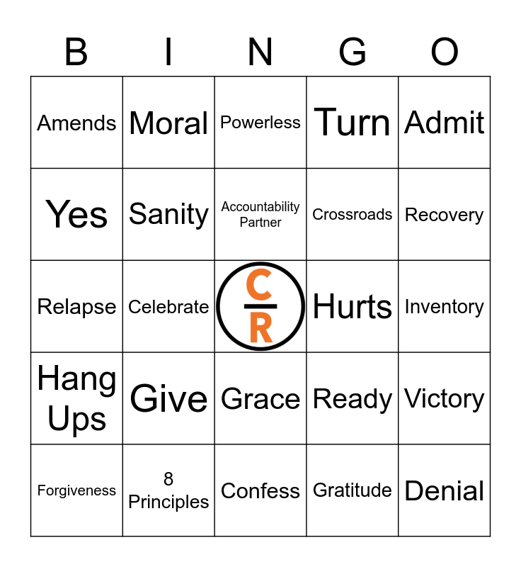 This bingo card has a free space and 31 words: 12 Steps, 8 Principles, Accountability Partner, Action, Admit, Amends, Celebrate, Confess, Crossroads, Denial, Forgiveness, Give, Gratitude, Habits, Hang Ups, Higher Power, Grace, Hurts, Inventory, Mercy, Moral, Hope, Ready, Recovery, Relapse, Sanity, Powerless, Turn, Victory, Yes and Sponsor.
