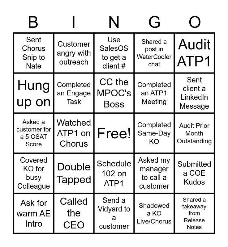 This bingo card has a free space and 24 words: Double Tapped, Called the CEO, CC the MPOC's Boss, Ask for warm AE Intro, Audit ATP1, Sent Chorus Snip to Nate, Hung up on, Customer angry with outreach, Completed Same-Day KO, Schedule 102 on ATP1, Completed an ATP1 Meeting, Asked a customer for a 5 OSAT Score, Asked my manager to call a customer, Submitted a COE Kudos, Completed an Engage Task, Shadowed a KO Live/Chorus, Audit Prior Month Outstanding, Use SalesOS to get a client #, Sent client a LinkedIn Message, Watched ATP1 on Chorus, Shared a takeaway from Release Notes, Covered KO for busy Colleague, Shared a post in WaterCooler chat and Send a Vidyard to a customer.