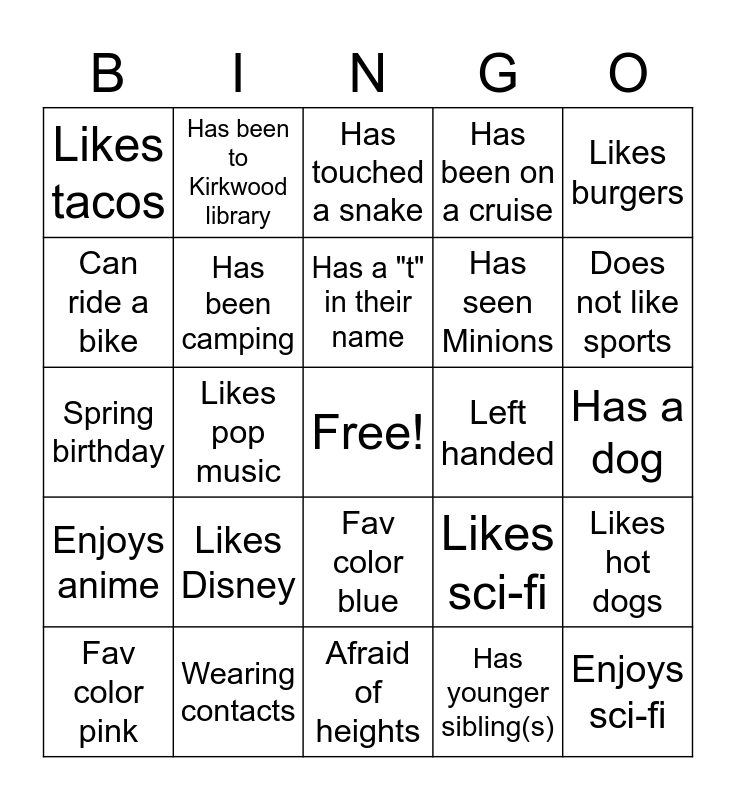 This bingo card has a free space and 24 words: Likes Disney, Wearing contacts, Has a "t" in their name, Fav color pink, Likes burgers, Likes tacos, Can ride a bike, Has been to Kirkwood library, Left handed, Fav color blue, Has seen Minions, Spring birthday, Likes sci-fi, Likes hot dogs, Has been camping, Has younger sibling(s), Has a dog, Has touched a snake, Does not like sports, Likes pop music, Enjoys sci-fi, Enjoys anime, Has been on a cruise and Afraid of heights.