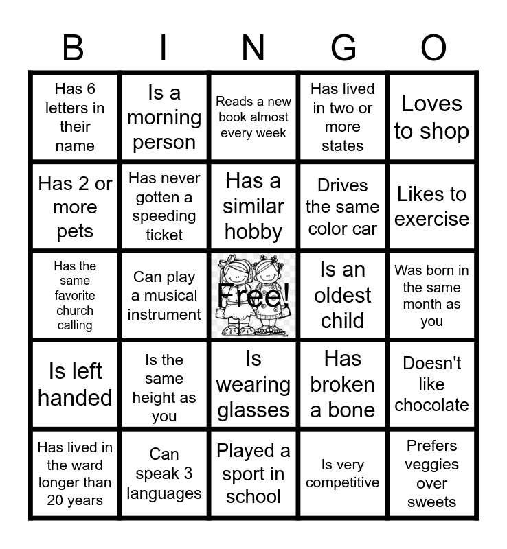 This bingo card has a free space and 24 words: Is the same height as you, Can speak 3 languages, Has a similar hobby, Has lived in the ward longer than 20 years, Loves to shop, Has 6 letters in their name, Has 2 or more pets, Is a morning person, Is an oldest child, Is wearing glasses, Drives the same color car, Has the same favorite church calling, Has broken a bone, Doesn't like chocolate, Has never gotten a speeding ticket, Is very competitive, Was born in the same month as you, Reads a new book almost every week, Likes to exercise, Can play a musical instrument, Prefers veggies over sweets, Is left handed, Has lived in two or more states and Played a sport in school.