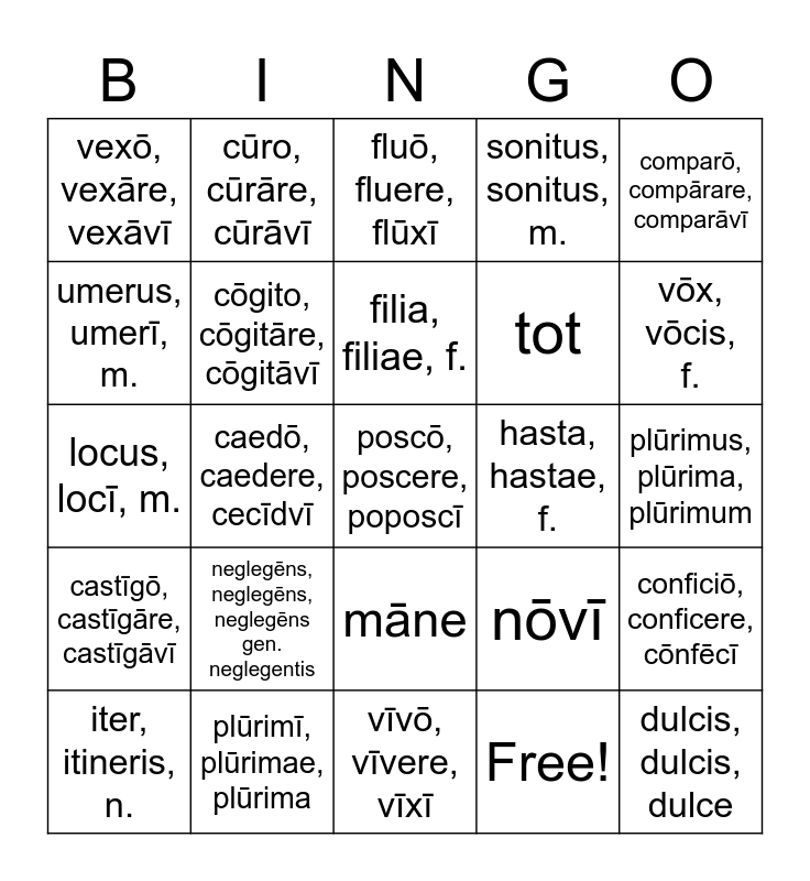 This bingo card has 32 words: Free!, amō, amāre, amāvī, caedō, caedere, cecīdvī, cārus, cāra, cārum, castīgō, castīgāre, castīgāvī, cōgito, cōgitāre, cōgitāvī, comparō, compārare, comparāvī, conficiō, conficere, cōnfēcī, cūro, cūrāre, cūrāvī, dulcis, dulcis, dulce, filia, filiae, f., fluō, fluere, flūxī, forte, grātiās agō, hasta, hastae, f., illūc, iter, itineris, n., locus, locī, m., māne, neglegēns, neglegēns, neglegēns gen. neglegentis, nōvī, perīculum, perīculī, n., plūrimus, plūrima, plūrimum, plūrimī, plūrimae, plūrima, poscō, poscere, poposcī, sonitus, sonitus, m., tot, umerus, umerī, m., vexō, vexāre, vexāvī, vīvō, vīvere, vīxī, vix and vōx, vōcis, f..