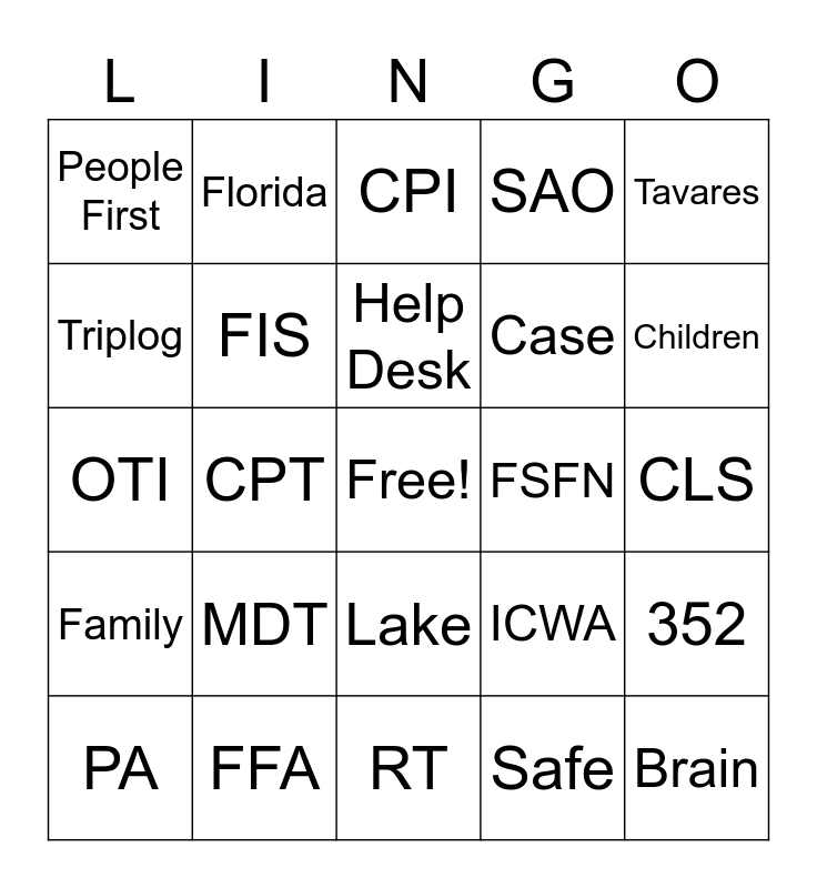 This bingo card has a free space and 29 words: PA, FSW, CPT, Family Finder, People First, CPI, FIS, MDT, FSFN, FFA, CLS, Brain, RT, Safe, Children, CRM, Lake, Family, Tavares, OTI, ICWA, PDA, Case, Triplog, SAO, Florida, 352, Help Desk and DCF.