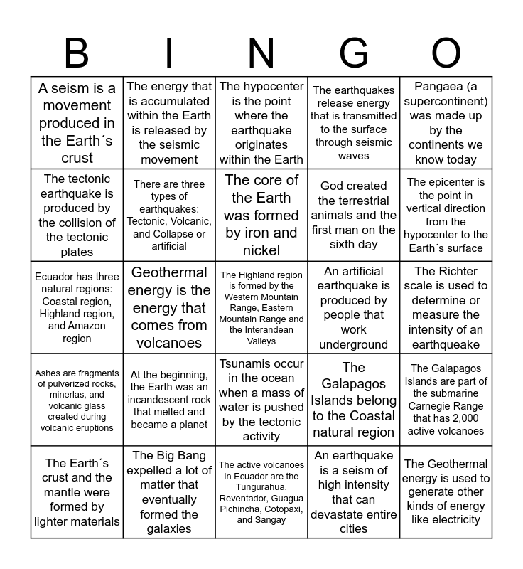 This bingo card has a free space and 24 words: At the beginning, the Earth was an incandescent rock that melted and became a planet, The Big Bang expelled a lot of matter that eventually formed the galaxies, The core of the Earth was formed by iron and nickel, The Earth´s crust and the mantle were formed by lighter materials, Pangaea (a supercontinent) was made up by the continents we know today, A seism is a movement produced in the Earth´s crust, The tectonic earthquake is produced by the collision of the tectonic plates, The energy that is accumulated within the Earth is released by the seismic movement, An artificial earthquake is produced by people that work underground, Tsunamis occur in the ocean when a mass of water is pushed by the tectonic activity, God created the terrestrial animals and the first man on the sixth day, Ecuador has three natural regions: Coastal region, Highland region, and Amazon region, The Galapagos Islands belong to the Coastal natural region, The Galapagos Islands are part of the submarine Carnegie Range that has 2,000 active volcanoes, There are three types of earthquakes: Tectonic, Volcanic, and Collapse or artificial, An earthquake is a seism of high intensity that can devastate entire cities, The Richter scale is used to determine or measure the intensity of an earthqueake, The hypocenter is the point where the earthquake originates within the Earth, The epicenter is the point in vertical direction from the hypocenter to the Earth´s surface, Geothermal energy is the energy that comes from volcanoes, The Geothermal energy is used to generate other kinds of energy like electricity, Ashes are fragments of pulverized rocks, minerlas, and volcanic glass created during volcanic eruptions, The earthquakes release energy that is transmitted to the surface through seismic waves and The active volcanoes in Ecuador are the Tungurahua, Reventador, Guagua Pichincha, Cotopaxi, and Sangay.