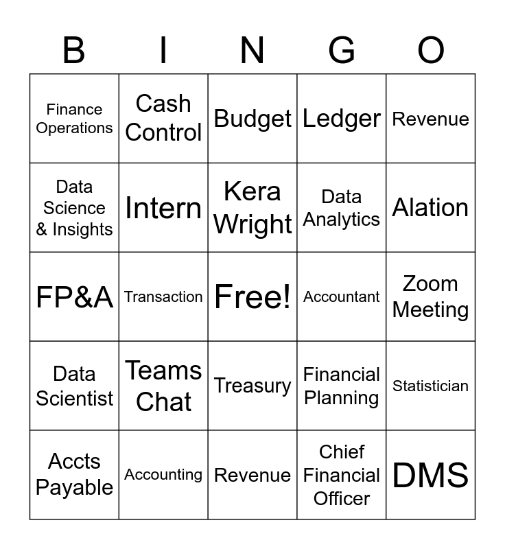 This bingo card has a free space and 24 words: Teams Chat, Accounting, Kera Wright, Accts Payable, Revenue, Finance Operations, Data Science & Insights, Cash Control, Accountant, Treasury, Data Analytics, FP&A, Financial Planning, Statistician, Intern, Chief Financial Officer, Zoom Meeting, Budget, Alation, Transaction, DMS, Data Scientist, Ledger and Revenue.