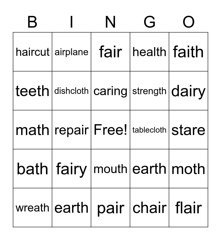 This bingo card has a free space and 24 words: fairy, earth, caring, wreath, faith, haircut, teeth, airplane, tablecloth, mouth, strength, math, earth, moth, dishcloth, chair, stare, fair, dairy, repair, flair, bath, health and pair.