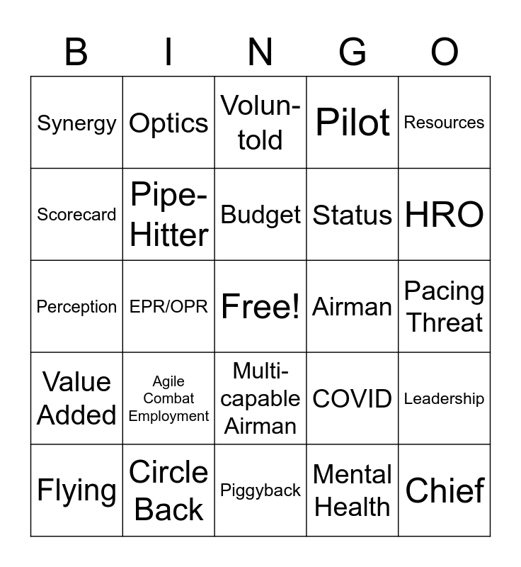 This bingo card has a free space and 44 words: Mission-focus, Chief, Ops/Mx, Flying, Wingman, Mental Health, Volun-told, Do More with Less, Resources, Circle Back, Pilot, Airman, Multi-capable Airman, Agile Combat Employment, BLUF, Piggyback, PT, Perception, Camp, HRO, Optics, Innovation, Diversity, Synergy, Holistic, Pacing Threat, China, Legacy, COVID, Value Added, Mentorship, Leadership, Mission, Warfighter, EPR/OPR, Trends, Suicide Prevention, Partnership, Budget, Scorecard, Status, Recruiting/ Retention, Pipe-Hitter and Respect.