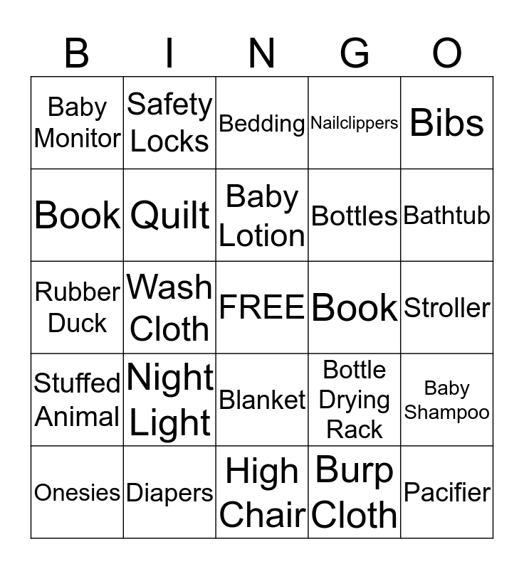 This bingo card has a free space and 24 words: Night Light, Diapers, Baby Lotion, Onesies, Bibs, Baby Monitor, Book, Safety Locks, Book, Blanket, Bottles, Rubber Duck, Bottle Drying Rack, Baby Shampoo, Quilt, Burp Cloth, Stroller, Bedding, Bathtub, Wash Cloth, Pacifier, Stuffed Animal, Nailclippers and High Chair.