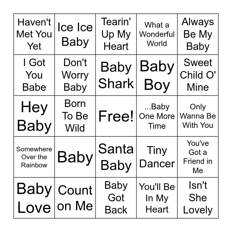 This bingo card has a free space and 25 words: Baby, Baby Got Back, Baby Shark, Baby Love, Always Be My Baby, Haven't Met You Yet, I Got You Babe, Ice Ice Baby, ...Baby One More Time, Santa Baby, Baby Boy, Hey Baby, Tiny Dancer, You've Got a Friend in Me, Don't Worry Baby, Come On Over Baby (All I Want Is You), Only Wanna Be With You, Tearin' Up My Heart, Sweet Child O' Mine, Born To Be Wild, Isn't She Lovely, Count on Me, Somewhere Over the Rainbow, What a Wonderful World and You'll Be In My Heart.