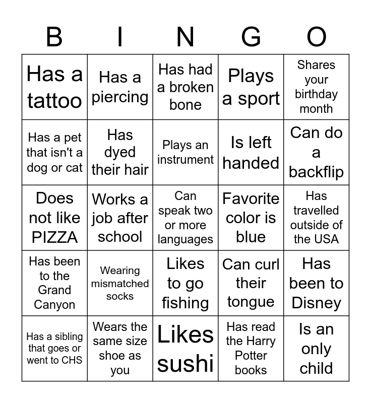 This bingo card has a free space and 24 words: Wearing mismatched socks, Wears the same size shoe as you, Plays an instrument, Has a sibling that goes or went to CHS, Shares your birthday month, Has a tattoo, Has a pet that isn't a dog or cat, Has a piercing, Favorite color is blue, Likes to go fishing, Is left handed, Does not like PIZZA, Can curl their tongue, Has been to Disney, Has dyed their hair, Has read the Harry Potter books, Has travelled outside of the USA, Has had a broken bone, Can do a backflip, Works a job after school, Is an only child, Has been to the Grand Canyon, Plays a sport and Likes sushi.