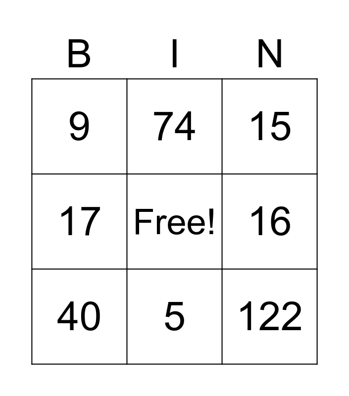This bingo card has a free space and 17 words: 703, 58, 15, 9, 29, 17, 65, 40, 5, 16, 1, 0.06, 122, 74, 4, 50 and 382.