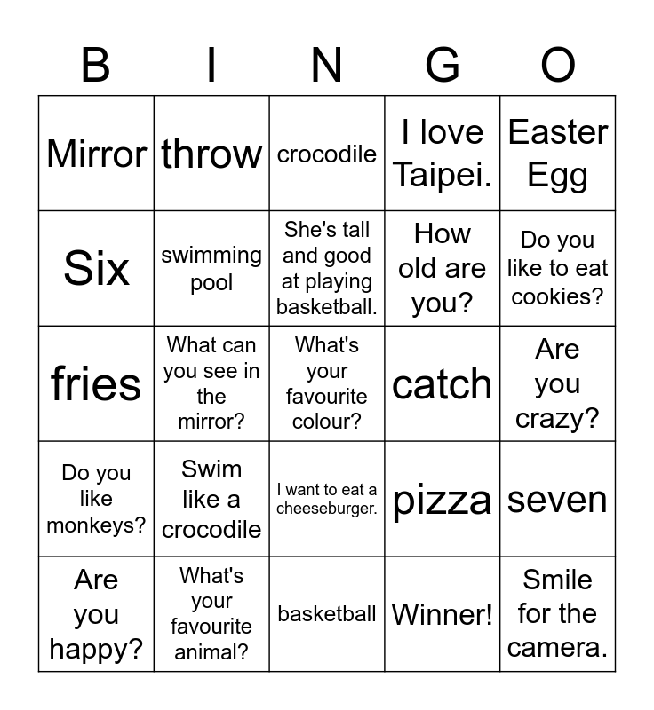This bingo card has 25 words: Swim like a crocodile, basketball, She's tall and good at playing basketball., Are you happy?, Easter Egg, Mirror, Six, throw, catch, I want to eat a cheeseburger., How old are you?, fries, pizza, seven, swimming pool, Smile for the camera., Are you crazy?, crocodile, Do you like to eat cookies?, What can you see in the mirror?, What's your favourite colour?, What's your favourite animal?, Do you like monkeys?, I love Taipei. and Winner!.