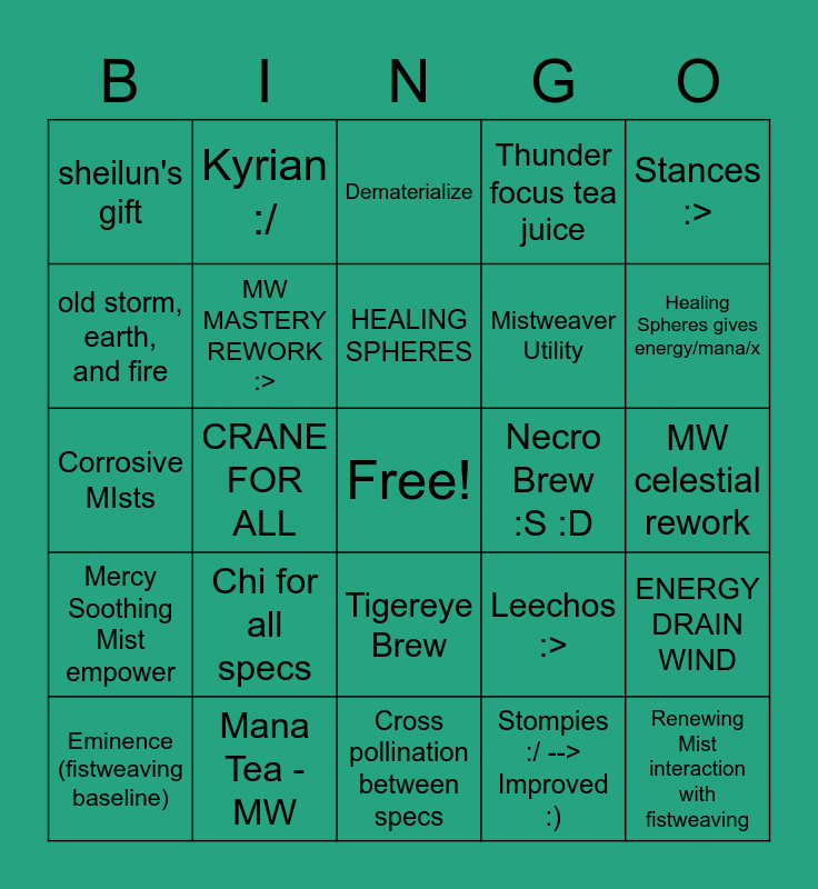 This bingo card has a free space and 24 words: Chi for all specs, Mana Tea - MW, HEALING SPHERES, Eminence (fistweaving baseline), Stances :>, sheilun's gift, old storm, earth, and fire, Kyrian :/, Necro Brew :S :D, Tigereye Brew, Mistweaver Utility, Corrosive MIsts, Leechos :>, ENERGY DRAIN WIND, MW MASTERY REWORK :>, Stompies :/ --> Improved :), MW celestial rework, Dematerialize, Healing Spheres gives energy/mana/x, CRANE FOR ALL, Renewing Mist interaction with fistweaving, Mercy Soothing Mist empower, Thunder focus tea juice and Cross pollination between specs.