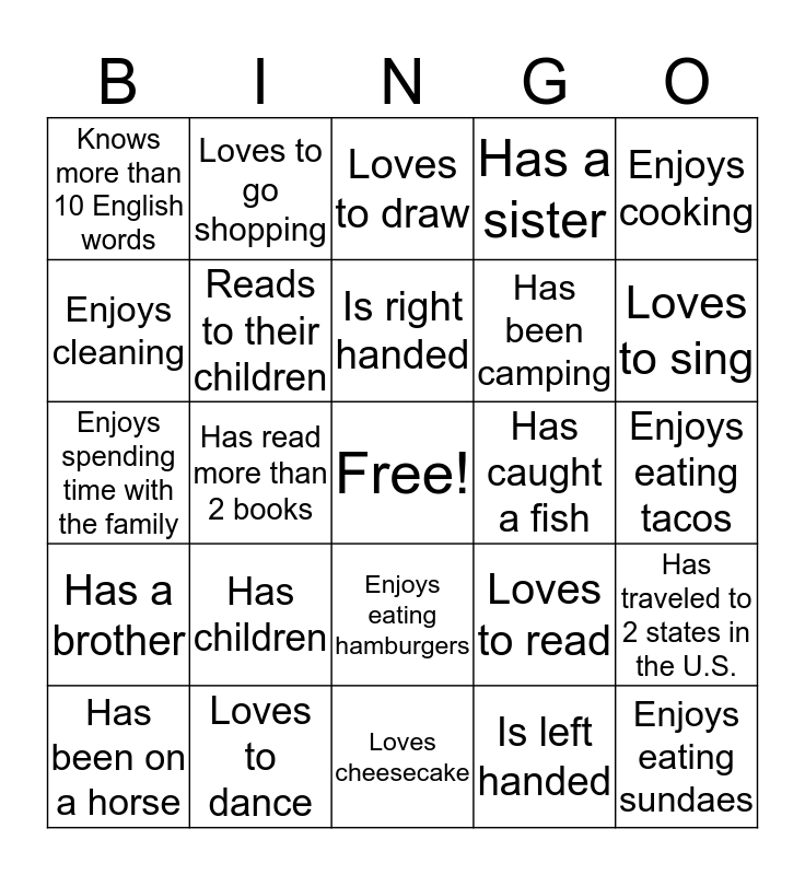 This bingo card has a free space and 24 words: Has children, Loves to dance, Is right handed, Has been on a horse, Enjoys cooking, Knows more than 10 English words, Enjoys cleaning, Loves to go shopping, Has caught a fish, Enjoys eating hamburgers, Has been camping, Enjoys spending time with the family, Loves to read, Has traveled to 2 states in the U.S., Reads to their children, Is left handed, Enjoys eating tacos, Loves to draw, Loves to sing, Has read more than 2 books, Enjoys eating sundaes, Has a brother, Has a sister and Loves cheesecake.