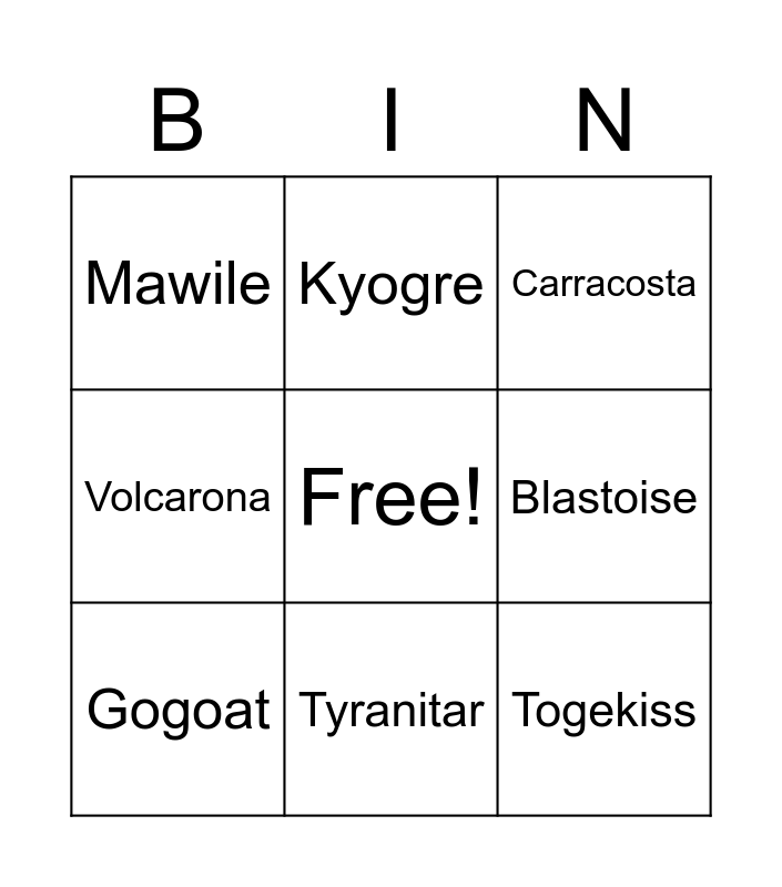 This bingo card has a free space and 8 words: Blastoise, Carracosta, Kyogre, Gogoat, Mawile, Togekiss, Volcarona and Tyranitar.