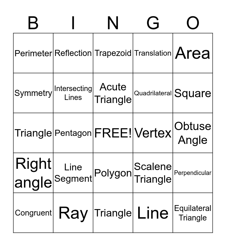 This bingo card has a free space and 24 words: Line Segment, Ray, Acute Triangle, Congruent, Area, Perimeter, Symmetry, Reflection, Vertex, Polygon, Quadrilateral, Triangle, Scalene Triangle, Perpendicular, Intersecting Lines, Line, Obtuse Angle, Trapezoid, Square, Pentagon, Equilateral Triangle, Right angle, Translation and Triangle.