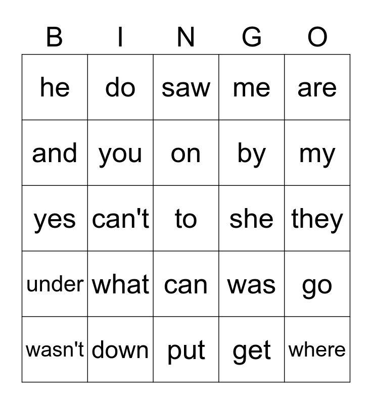 This bingo card has 35 words: see, I, the, you, can, me, and, we, on, is, yes, are, no, isn't, he, she, get, can't, under, to, was, wasn't, go, down, saw, my, where, here, by, they, little, put, what, do and like.