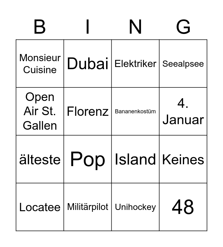 This bingo card has 24 words: Elisabeth, Fabienne, 4. Januar, Blockflöte, Open Air St. Gallen, Monsieur Cuisine, Florenz, Dubai, Militärpilot, 12. August, älteste, Island, Wassermelone, Lustiges Taschenbuch, Bananenkostüm, Burrata Spaghetti, Unihockey, Elektriker, Pop, Keines, Locatee, 48, Seealpsee and Dublin.