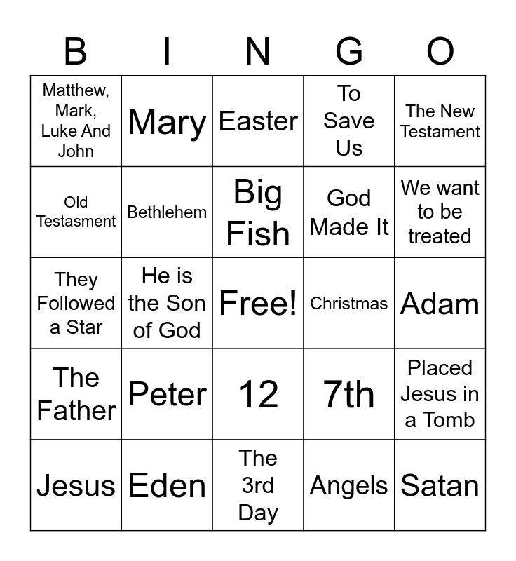 This bingo card has a free space and 24 words: Peter, Eden, Big Fish, Jesus, The New Testament, Matthew, Mark, Luke And John, Old Testasment, Mary, Christmas, 12, God Made It, They Followed a Star, 7th, Placed Jesus in a Tomb, Bethlehem, Angels, Adam, Easter, We want to be treated, He is the Son of God, Satan, The Father, To Save Us and The 3rd Day.