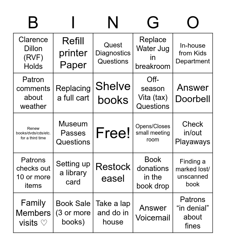 This bingo card has a free space and 25 words: Setting up a library card, Take a lap and do in house, Shelve books, Family Members visits ♡, In-house from Kids Department, Clarence Dillon (RVF) Holds, Patron comments about weather, Refill printer Paper, Opens/Closes small meeting room, Restock easel, Off-season Vita (tax) Questions, Renew books/dvds/cds/etc. for a third time, Book donations in the book drop, Finding a marked lost/ unscanned book, Replacing a full cart, Renewing a library registration, Check in/out Playaways, Quest Diagnostics Questions, Answer Doorbell, Museum Passes Questions, Patrons “in denial” about fines, Book Sale (3 or more books), Patrons checks out 10 or more items, Replace Water Jug in breakroom and Answer Voicemail.