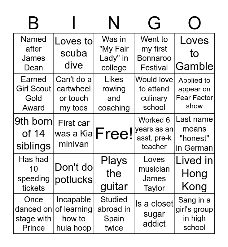 This bingo card has a free space and 24 words: Don't do potlucks, Incapable of learning how to hula hoop, Likes rowing and coaching, Once danced on stage with Prince, Loves to Gamble, Named after James Dean, Earned Girl Scout Gold Award, Loves to scuba dive, Worked 6 years as an asst. pre-k teacher, Plays the guitar, Would love to attend culinary school, 9th born of 14 siblings, Loves musician James Taylor, Lived in Hong Kong, Can't do a cartwheel or touch my toes, Is a closet sugar addict, Last name means "honest" in German, Was in "My Fair Lady" in college, Applied to appear on Fear Factor show, First car was a Kia minivan, Sang in a girl's group in high school, Has had 10 speeding tickets, Went to my first Bonnaroo Festival and Studied abroad in Spain twice.