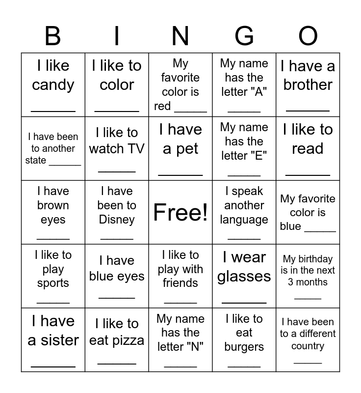 This bingo card has a free space and 24 words: I have blue eyes _____, I like to eat pizza _____, I have a pet _____, I have a sister _____, I have a brother _____, I like candy _____, I have been to another state ______, l like to color _____, I speak another language _____, I like to play with friends _____, My name has the letter "E" _____, I have brown eyes _____, I wear glasses _____, My birthday is in the next 3 months _____, I like to watch TV _____, I like to eat burgers _____, My favorite color is blue _____, My favorite color is red _____, I like to read _____, I have been to Disney _____, I have been to a different country _____, I like to play sports _____, My name has the letter "A" _____ and My name has the letter "N" _____.