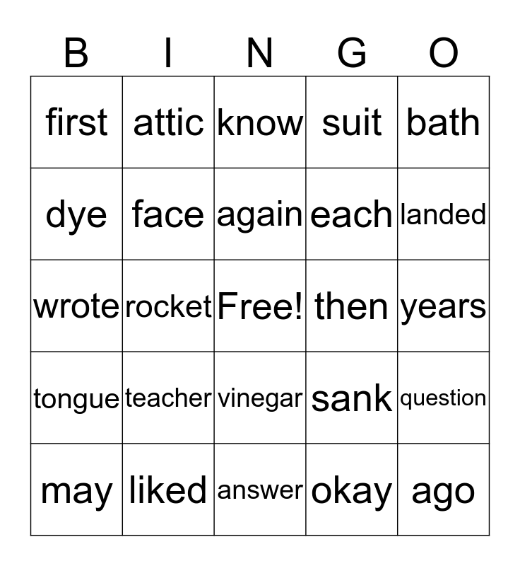 This bingo card has a free space and 36 words: clean, can, said, face, sank, tongue, again, am, bath, Earth, rocket, suit, back, then, landed, first, famous, teacher, ago, know, years, question, liked, may, answer, attic, wrote, hunt, each, dye, drew, day, okay, vinegar, do and colored.