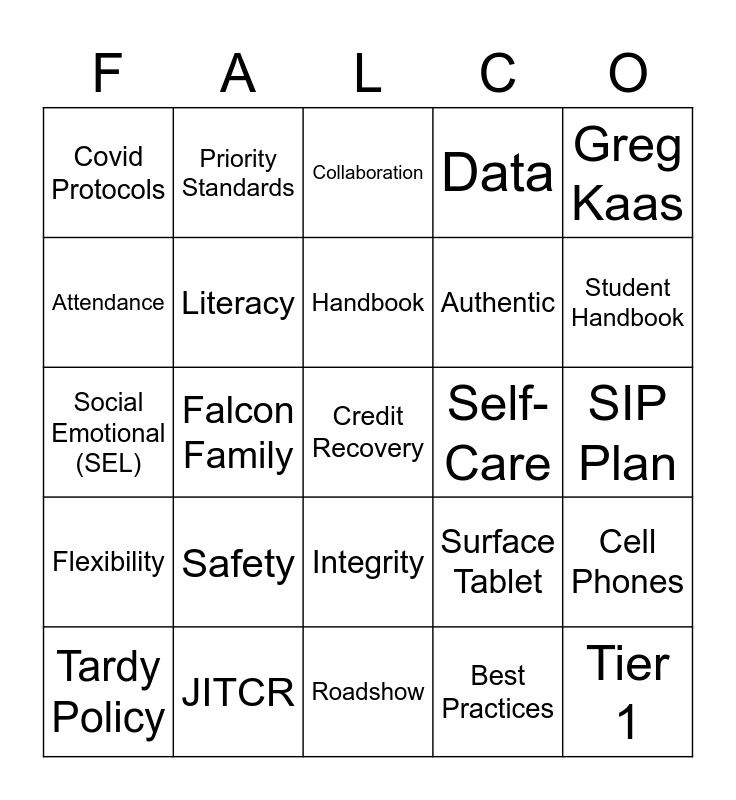This bingo card has 40 words: Standards, Social Emotional (SEL), Lockdown, Literacy, JITCR, Integrity, Handbook, Growth, Greg Kaas, Flexibility, Falcon Family, Data, Credit Recovery, SIP Plan, Self-Care, Safety, Safe Schools, Covid Protocols, Community, Collaboration, Cell Phones, Best Practices, Authentic, Attendance, Assemblies, Academy, 25th Anniversary, Trauma-Informed, Tier 1, Team Support, Teacher Directed Days, Tardy Policy, Syllabus, Surface Tablet, Student Handbook, Roadshow, Restorative Practices, Relationships, Priority Standards and PLC.