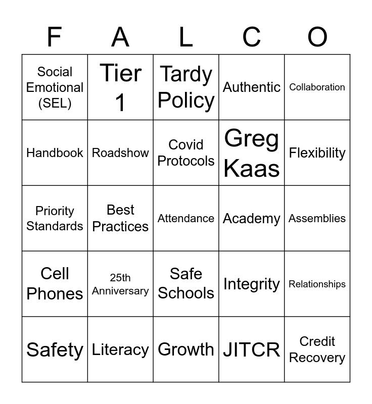 This bingo card has 39 words: Syllabus, Surface Tablet, Student Handbook, Roadshow, Safety, Safe Schools, Covid Protocols, Community, Collaboration, Cell Phones, Best Practices, Authentic, Attendance, Assemblies, Academy, 25th Anniversary, Trauma-Informed Standards, Social Emotional (SEL), Lockdown, Integrity, Handbook, Growth, Greg Kaas, Flexibility, Falcon Family, Data, Credit Recovery, SIP Plan, Self-Care, Tier 1, Team Support, Teacher Directed Days, Tardy Policy, Literacy, JITCR, Restorative Practices, Relationships, Priority Standards and PLC.