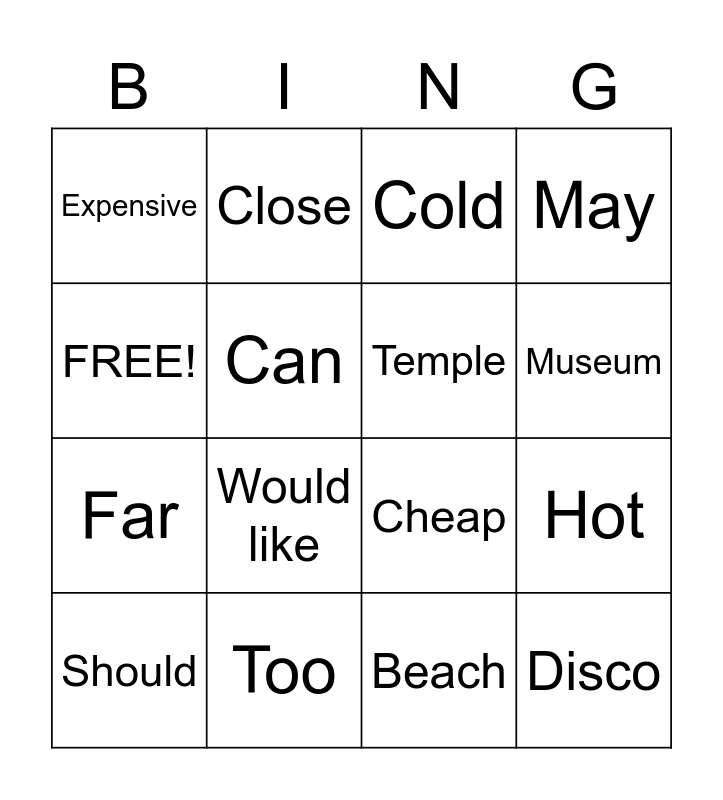 This bingo card has 16 words: Too, Hot, Cold, Expensive, Far, Close, Cheap, Beach, FREE!, Can, Should, May, Would like, Museum, Temple and Disco.