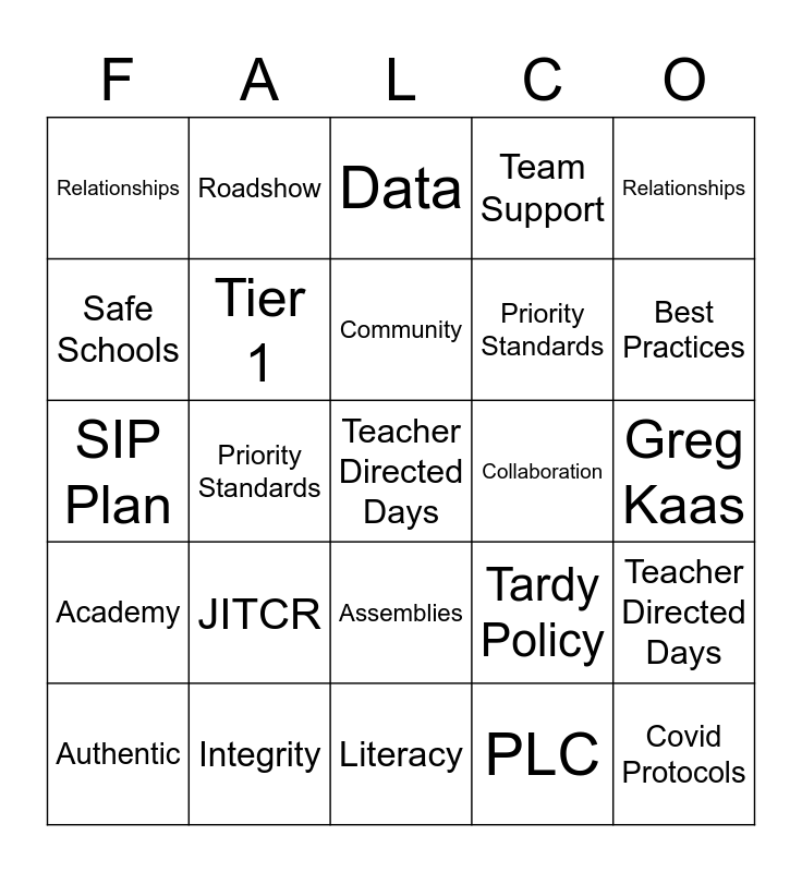 This bingo card has 48 words: Team Support, Teacher Directed Days, Tardy Policy, Literacy, JITCR, Restorative Practices, Roadshow, Safety, Safe Schools, Self-Care, Tier 1, Team Support, Teacher Directed Days, Tardy Policy, Literacy, JITCR, Community, Collaboration, Cell Phones, Relationships, Priority Standards, PLC, Relationships, Priority Standards, PLC, Best Practices, Authentic, Attendance, Assemblies, Academy, 25th Anniversary, Trauma-Informed Standards, Social Emotional (SEL), Lockdown, Integrity, Handbook, Growth, Greg Kaas, Flexibility, Falcon Family, Restorative Practices, Covid Protocols, Data, Credit Recovery, SIP Plan, Syllabus, Surface Tablet and Student Handbook.