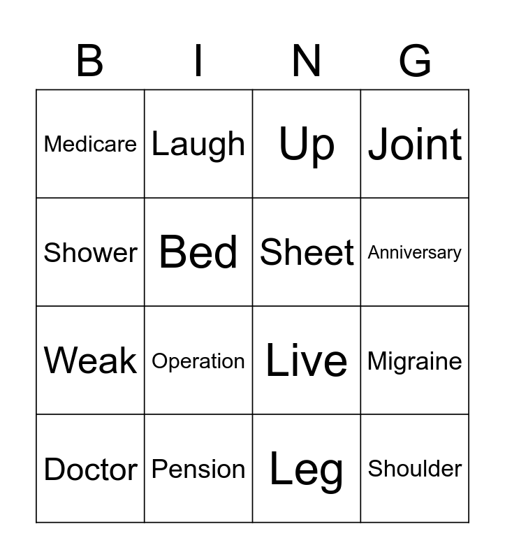 This bingo card has 241 words: Free!, Senior, Junior, Old, School, Citizen, Hip, Thigh, Waist, Bone, Pelvis, Prescription, Doctor, Paper, Medicine, Pharmacy, Surgeon, Doctor, Surgery, Operation, Hospital, Ankle, Sprain, Leg, Foot, Break, Allergy, Sneeze, Itch, Spring, Season, Workout, Gym, Weight, Train, Exercise, Retired, Work, Relax, Old, Pension, Travel, Vacation, Visit, Plane, Country, Celebrate, Party, Birthday, Anniversary, Friends, Weak, Strong, Muscle, Small, Strength, Stairs, Up, Down, Climb, House, Nurse, Care, Patient, Sick, Hospital, Blanket, Warm, Bed, Sheet, Cover, Couch, Sit, Living Room, TV, Relax, Wake Up, Morning, Bed, Early, Get Up, Home, Live, House, Sleep, Family, Surgery, Scalpel, Doctor, Operation, Cut, Tea, Coffee, Cup, Drink, Pot, Access A Ride, Taxi, Uber, Fare, Car, Therapy, Physical, Group, Speech, Mental, Croissant, French, Bread, Pastry, France, Laugh, Joke, Smile, Funny, Cry, Potato Salad, Mayonnaise, Dressing, Bowl, Vegetables, Knee, Elbow, Joint, Leg, Ankle, Cane, Sugar, Stick, Candy, Whip, Wheelchair, Ramp, Disabled, Cripple, Handicapped, Crutches, Cripple, Wheelchair, Crippled, Support, Pain, Hurt, Ouch, Ache, Agony, Memory, Remember, Forget, Recall, Loss, Pension, Scheme, Retire, Money, Old Age, Medicare, Voucher, Card, Healthcare, Agency, Glasses, Eyes, Lens, See, Cups, Magnify, Microscope, Enlarge, Lens, Zoom, Headache, Pain, Migraine, Aspirin, Brain, Slip, Slide, Fall, Bra, Tongue, Exercise, Gym, Run, Fitness, Active, Walk, Run, Stroll, Talk, Promenade, Wig, Hair, Bald, Toupee, Fake, Stiff, Rigid, Erect, Hard, Neck, Teeth, Dentist, Mouth, Bite, Gums, Arthritis, Joint, Pain, Knee, Muscle, Gray, Black, White, Hair, Elephant, Ointment, Lotion, Cream, Medicine, Heal, Hearing, Aid, Deaf, Ear, Sound, Heating Pad, Warm, Knee, Shoulder, Electric, Bath, Tub, Shower, Towel, Soap, Bunion, Foot, Toe, Swollen and Bulge.