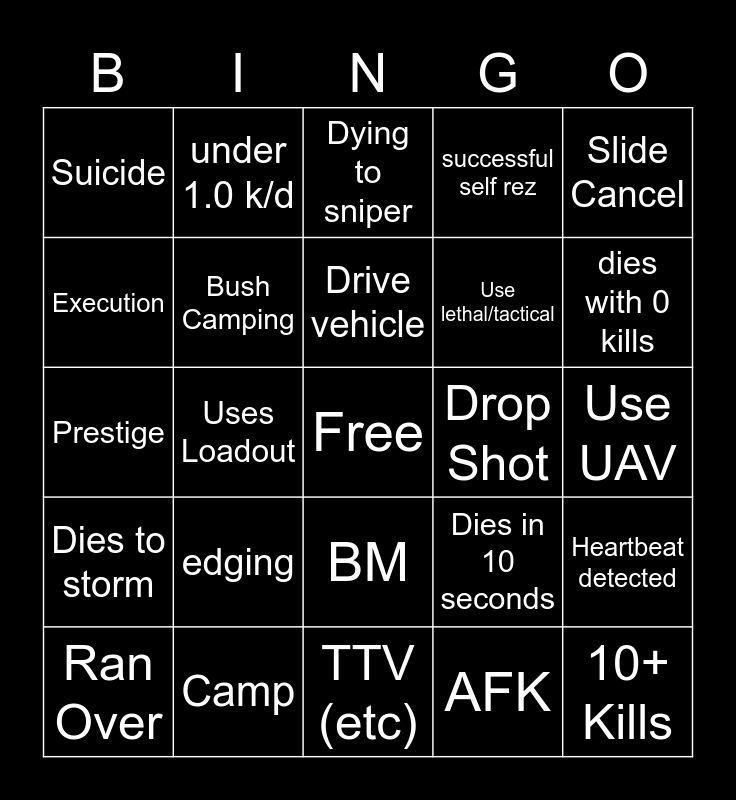 This bingo card has a free space and 24 words: edging, Camp, Drive vehicle, Ran Over, Slide Cancel, Suicide, Execution, under 1.0 k/d, Drop Shot, BM, Use lethal/tactical, Prestige, Dies in 10 seconds, Heartbeat detected, Bush Camping, AFK, Use UAV, Dying to sniper, dies with 0 kills, Uses Loadout, 10+ Kills, Dies to storm, successful self rez and TTV (etc).