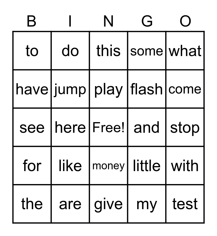 This bingo card has a free space and 24 words: the, like, play, my, what, to, do, this, and, stop, see, jump, little, with, have, are, give, some, come, for, here, money, flash and test.