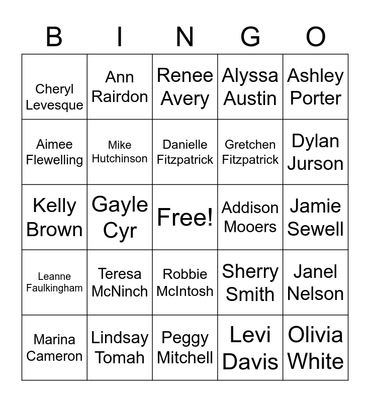 This bingo card has a free space and 59 words: Morgan Drake, Lindsay Tomah, Lizzi Gerritsen, Leanne Faulkingham, Levi Davis, Cindy Peterson, Mike Hutchinson, Olivia Gogan, Gretchen Fitzpatrick, Jenna Owen, Alyssa Austin, Autumn LaPointe, Aimee Flewelling, Jacqui Rogers, Harmony Russell, Cheryl Levesque, Olivia White, Ashley Porter, Kristie Spittle, Danielle Fitzpatrick, Addison Mooers, Renee Avery, Marina Cameron, Janel Nelson, Suzann Lawlor, Charles Duffield, Craig Greenier, Christina Wright, Dylan Jurson, Abbie Glidden, Amie Belyea, Casey Quint, Sherry Hubert, Cassie Merritt, Ann Rairdon, Sheila Schneider, Tracy Bouchard, Gayle Cyr, Katie Mania, Kelly Brown, April Kellerhals, Teresa McNinch, Jamie Sewell, Josh Suitter, Nicole Wright, MaryAnne Hare, Christine Hunt, Peggy Martin, Robbie McIntosh, Peggy Mitchell, Kristie Weston, Erica Crawford, Mary McGillicuddy, Natasha Klinger, Gary Joslyn, Sherry Smith, Robert Hannigan, Krystal Jones and George Lycette.