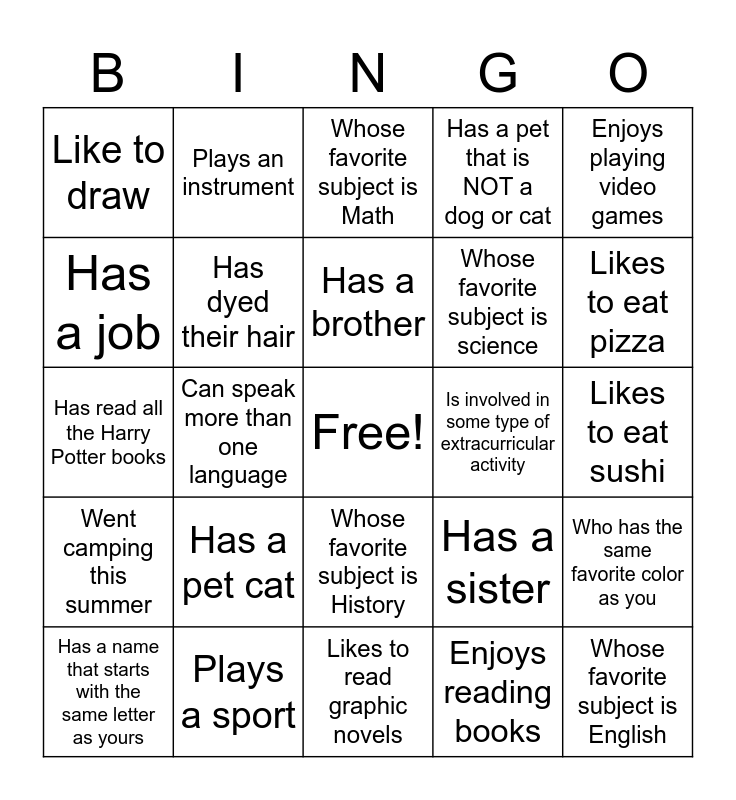 This bingo card has a free space and 24 words: Has a pet cat, Plays a sport, Has a brother, Has a name that starts with the same letter as yours, Enjoys playing video games, Like to draw, Has a job, Plays an instrument, Is involved in some type of extracurricular activity, Whose favorite subject is History, Whose favorite subject is science, Has read all the Harry Potter books, Has a sister, Who has the same favorite color as you, Has dyed their hair, Enjoys reading books, Likes to eat sushi, Whose favorite subject is Math, Likes to eat pizza, Can speak more than one language, Whose favorite subject is English, Went camping this summer, Has a pet that is NOT a dog or cat and Likes to read graphic novels.