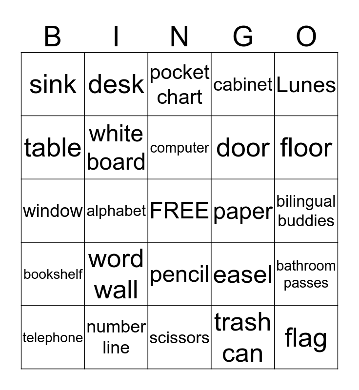 This bingo card has a free space and 24 words: word wall, number line, computer, telephone, Lunes, sink, table, desk, paper, pencil, door, window, easel, bathroom passes, white board, trash can, bilingual buddies, pocket chart, floor, alphabet, flag, bookshelf, cabinet and scissors.