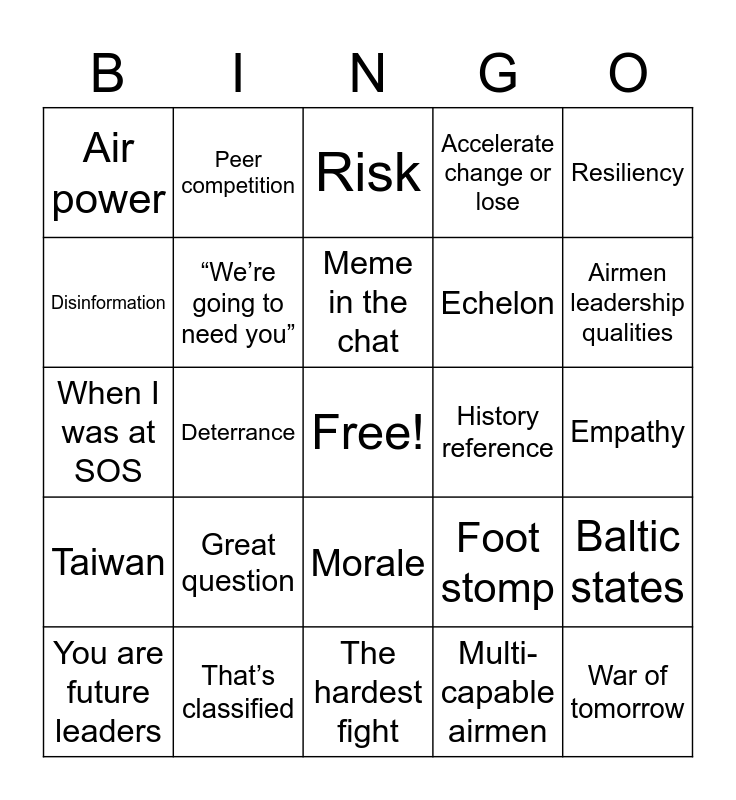 This bingo card has a free space and 34 words: Agile combat employment, Multi-capable airmen, Joint operations, General so-and-so, Taiwan, “We’re going to need you”, Resiliency, You are future leaders, Peer competition, The AF of today/tomorrow, Meme in the chat, Risk, Sports reference, Diversity, History reference, Airmen leadership qualities, That’s classified, When I was at SOS, Great question, Foot stomp, Morale, Space force, Air power, Empathy, The hardest fight, War of tomorrow, Accelerate change or lose, B18 gets a bingo, Echelon, Disinformation, Twitter, Deterrance, Baltic states and Soviet.