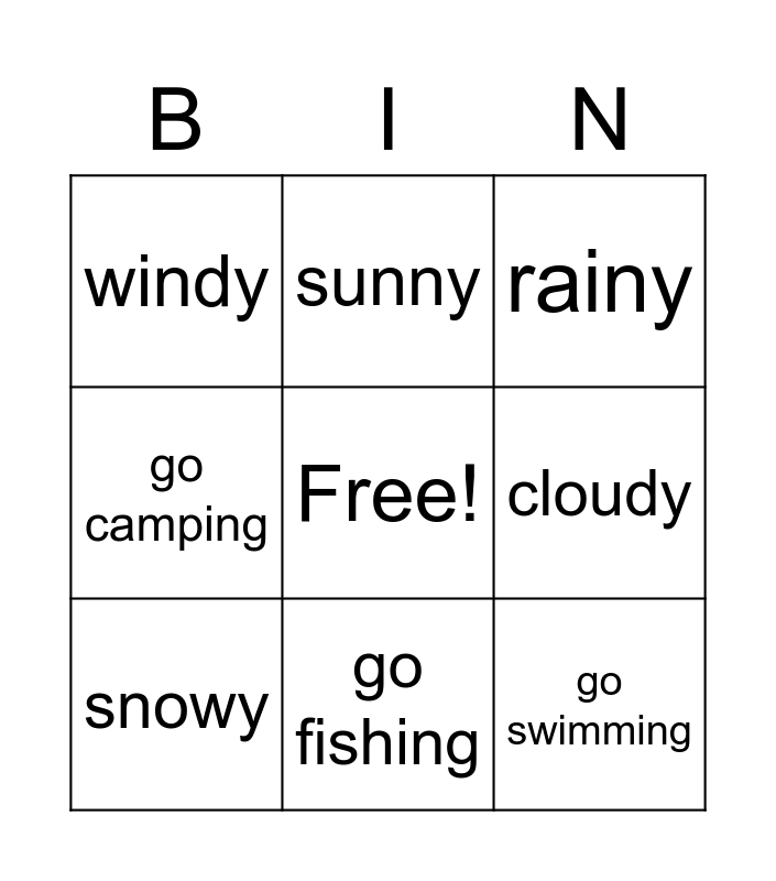 This bingo card has a free space and 8 words: cloudy, rainy, sunny, snowy, windy, go swimming, go camping and go fishing.