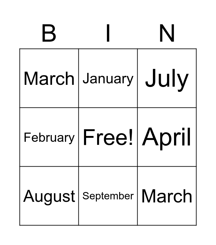 This bingo card has a free space and 9 words: August, July, January, February, March, April, March, June and September.